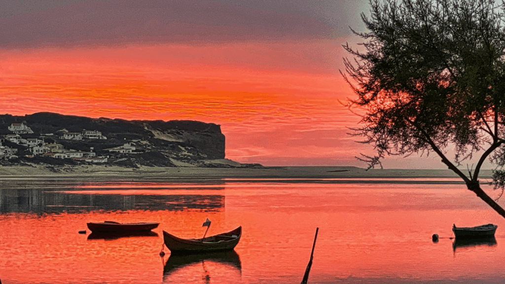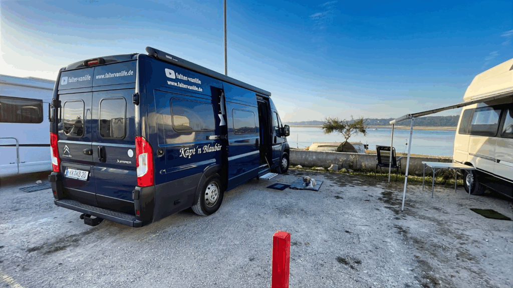 Heute Morgen bei der Runde mit Tommy gibt es in Praia do Mira an der kleinen Lagune eine tolle Stimmung, die ich unbedingt festhalten will. Nach dem Duschen und Frühstück geht es dann 163 km südlich zu dem Stellplatz, an dem ich vor 5 Jahren zur Coronazeit war – Parque de Pernoita de Autocaravanas da Foz do Arelho, zur Zeit 7 € ohne Strom, 10 € mit Strom. Zum Leidwesen von Uschi sind keine Stromplätze frei, da nur ein kleiner Bereich des Platzes mit Stromsäulen ausgestattet ist.. Unterwegs kaufen wir noch jeder eine Prepaidkarte für den Router bei NOS, da ja O2 entgegen der bisherigen Informationen jetzt auch das Datenvolumen im EU Ausland begrenzt, worüber ich ziemlich sauer bin. Ich war zu O2 gewechselt, weil ich das komplette Volumen auch im EU Ausland nutzen konnte. Nach dem Einkauf geht es zu einer Auto-Waschstation – nun sind unsere Fahrzeuge wieder ansehnlich. Der Stellplatz an der Lagune von Obidos ist fast komplett gefüllt und wir bekommen noch zwei Plätze in zweiter Reihe. Wir werden hier zwei oder drei Tage bleiben, da ich morgen mein neues Video schneiden will.