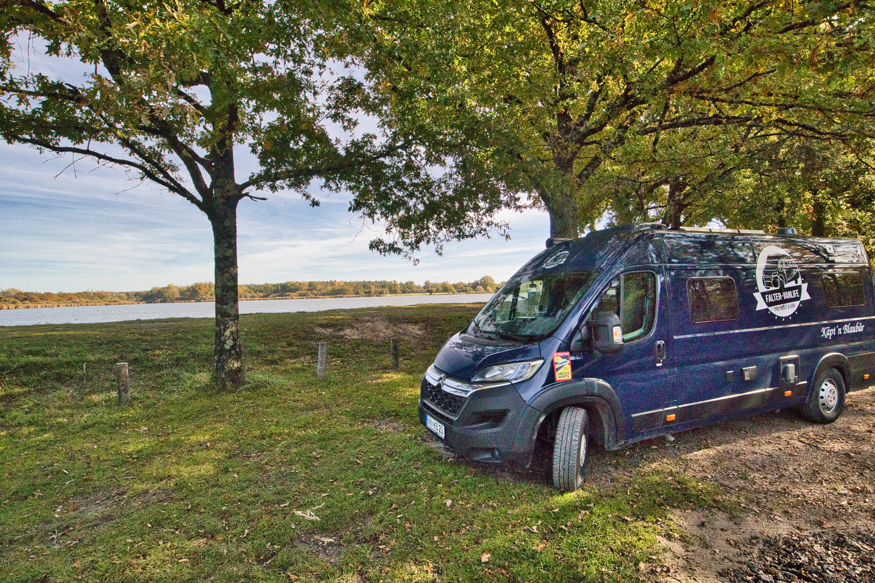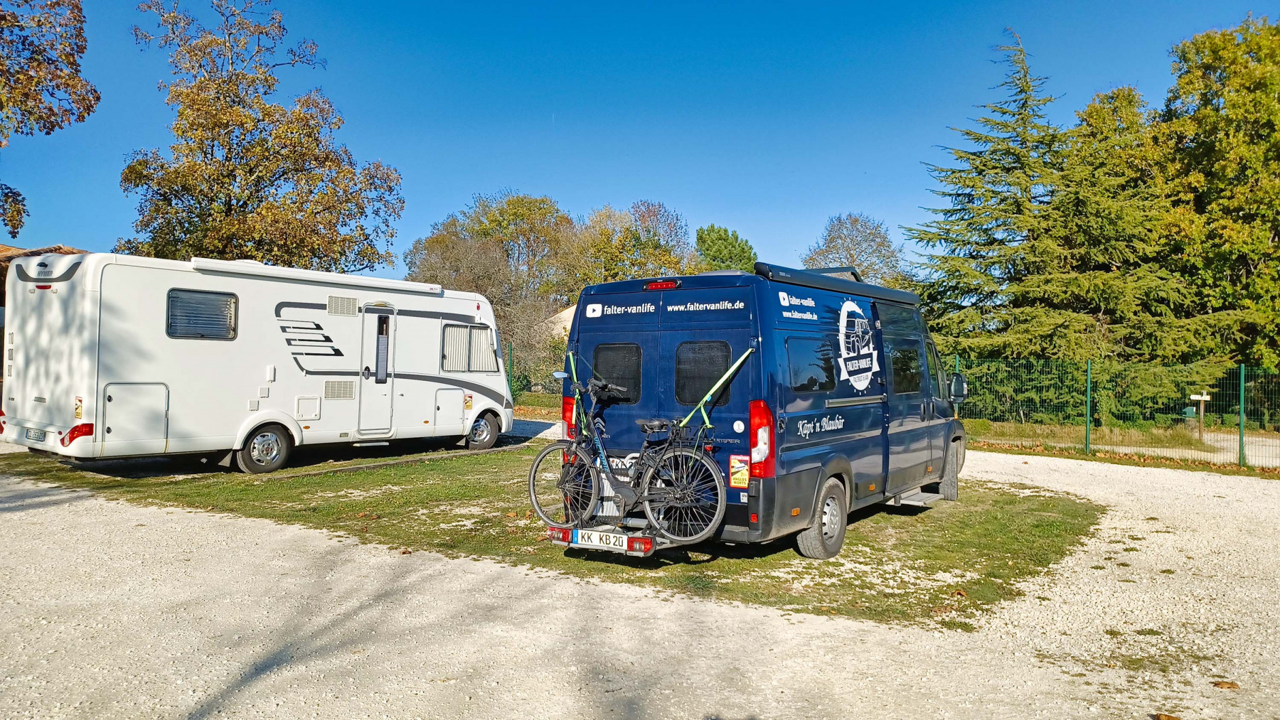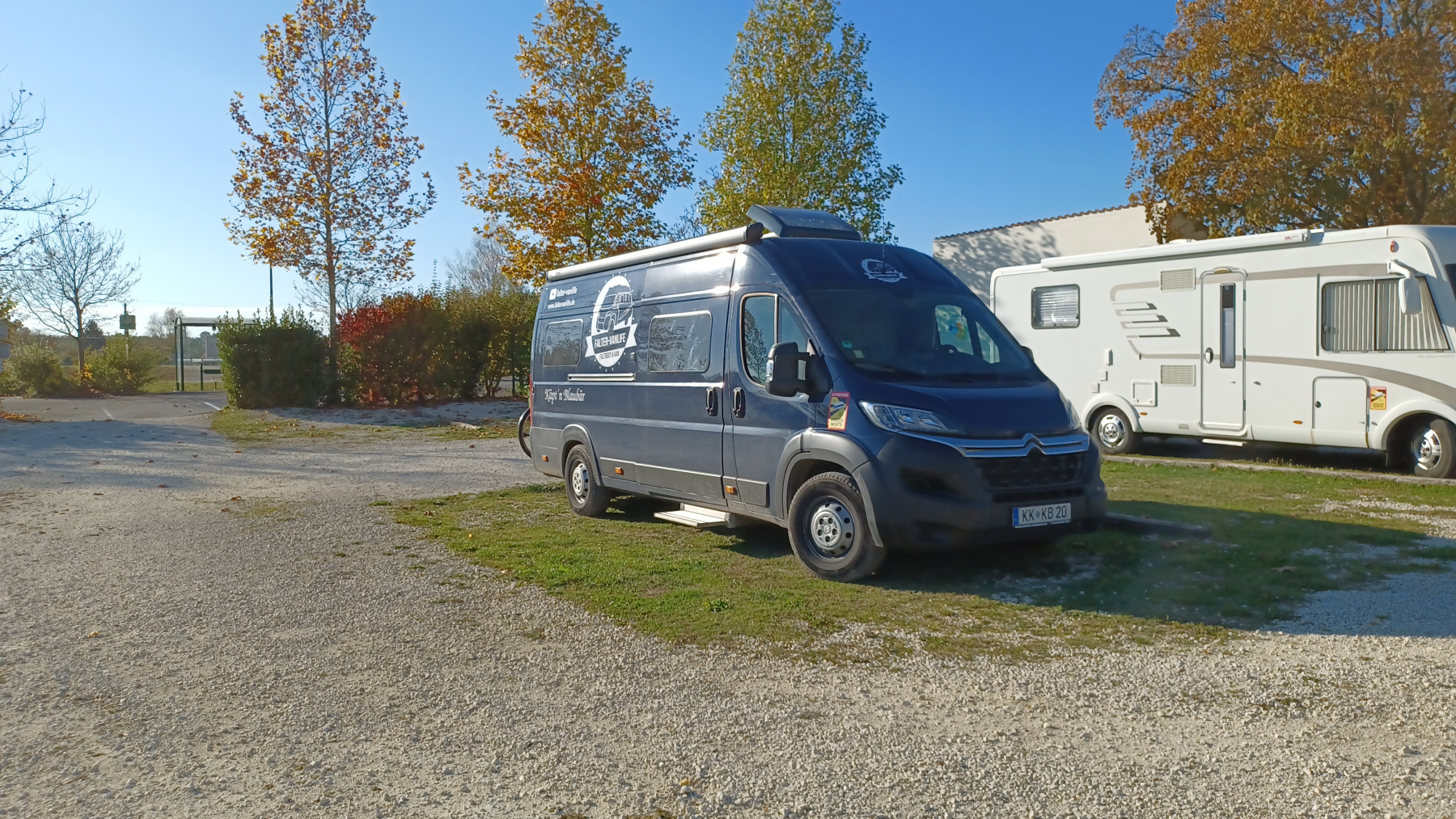 Die Nacht war absolut ruhig, obwohl der Platz direkt an der Kreuzung zweier Straßen liegt. Gegen 10 Uhr starte ich weiter auf meiner Route Richtung Spanien und Portugal. Ich fahre bis Luan, wo es ebenfalls einen kostenlosen Stellplatz mit Ver- und Entsorgung direkt an einem See gibt. Ich habe mich erst direkt neben den See unter Bäume gestellt, doch das war, wie ich dann feststelle nicht der korrekte Stellplatz. Außerdem hatte ich etwas Angst, dass bei diesem zum Teil heftigeren Herbstwind vielleicht ein paar kleinere Äste herunterfallen könnten. So bin ich dann auf den korrekten Platz umgezogen.