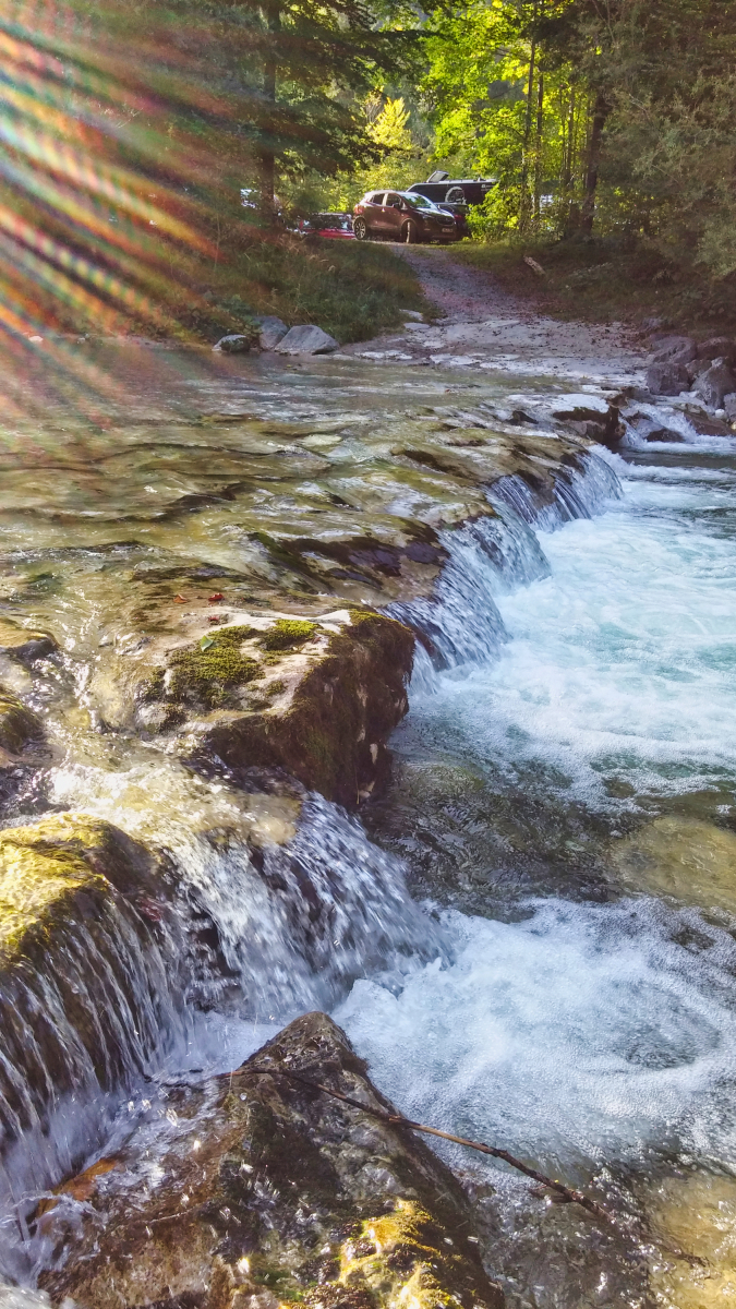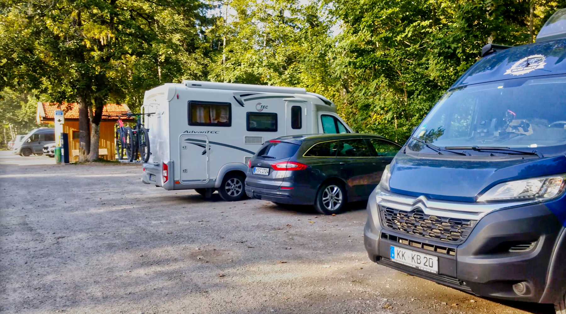 Heute fahre ich zur deutschen Alpenstraße, um auf ihr bis zum Bodensee zu fahren. Ich erreiche die Strecke südlich von Rosenheim in der Nähe des Inn und fahre schöne, kurvige und bergige Strecken in westlicher Richtung, bis ich in Wildbad Kreuth ankomme. Ja das Wildbad Kreuth, wo die CSU bis etwa 2018 ihre Tagungen abgehalten hat. Dort gibt es einen Parkplatz direkt an der Weißach, auf dem auch einige Wohnmobilstellplätze sind. Er ist kostenpflichtig, bietet aber außer Ver- und Entsorgung auch Toiletten.