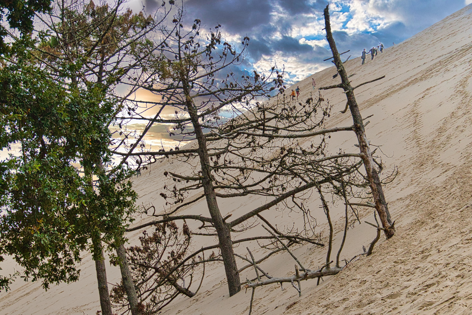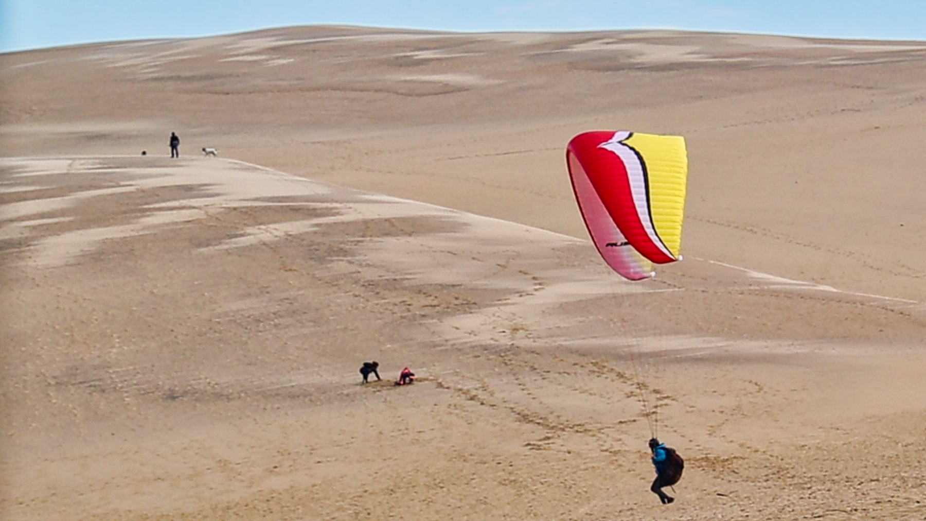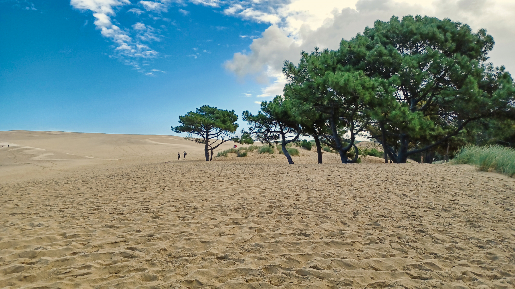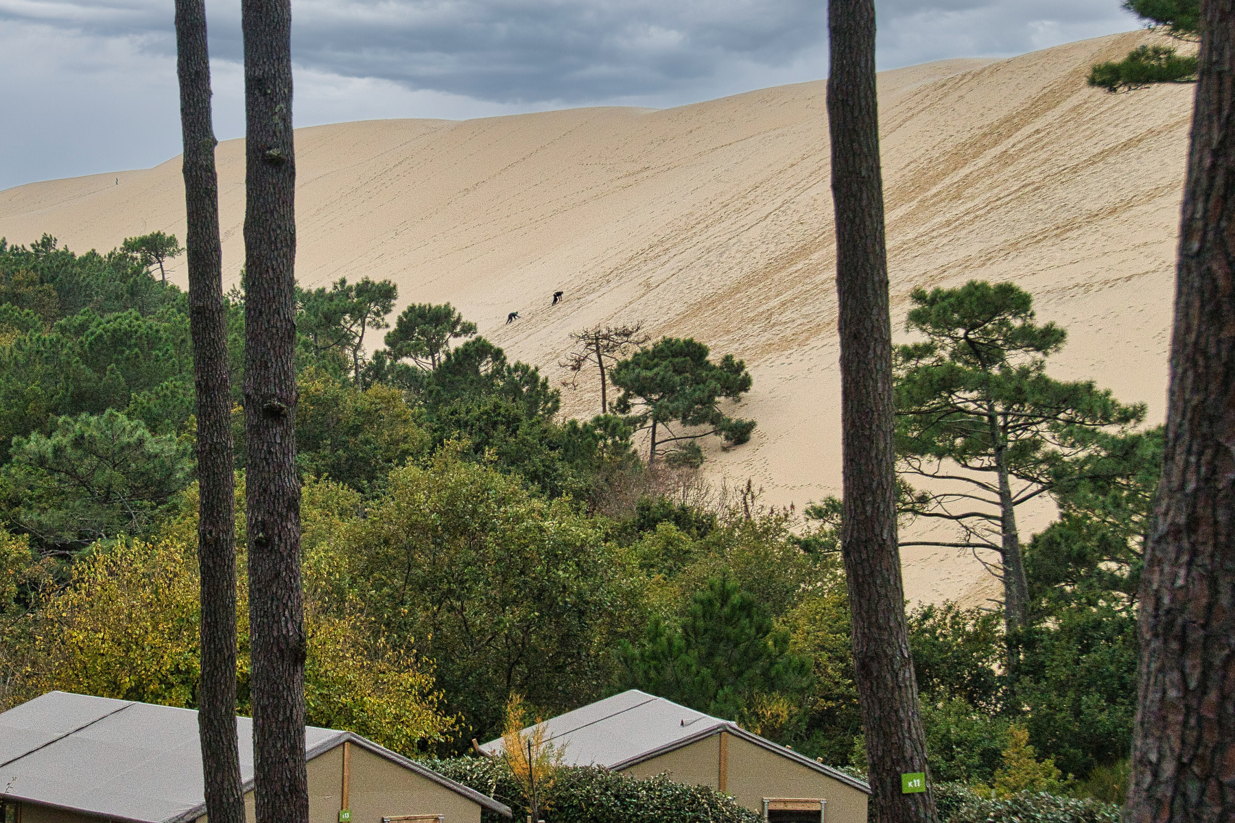 In Bordeaux kann ich leider keine weiteren Sehenswürdigkeiten anschauen, da die Parkplätze in deren Nähe alle entweder überfüllt oder nicht geeignet für meinen Camper sind. So fahre ich weiter bis an die Atlantikküste bei Arcachon. Hier gibt drei Campingplätze direkt an der höchsten Düne Europas, einer davon ist saisonbedingt noch zwei Wochen geöffnet. Die Düne selbst ist mit ihren etwa 110m Höhe sehr imposant und man hat von dort oben bestimmt einen tollen Ausblick. Meine Kondition lässt jedoch doch arg zu wünschen übrig und es fängt außerdem in recht kurzen Abständen immer wieder an zu regnen – mein Glück Auf dem Campingplatz gibt es auch einen Mini-Streichelzoo mit einem Esel und einem Shetland-Pony. Auf den Ausläufern der Düne starten oft Paraglider oder versuchen es zumindest.