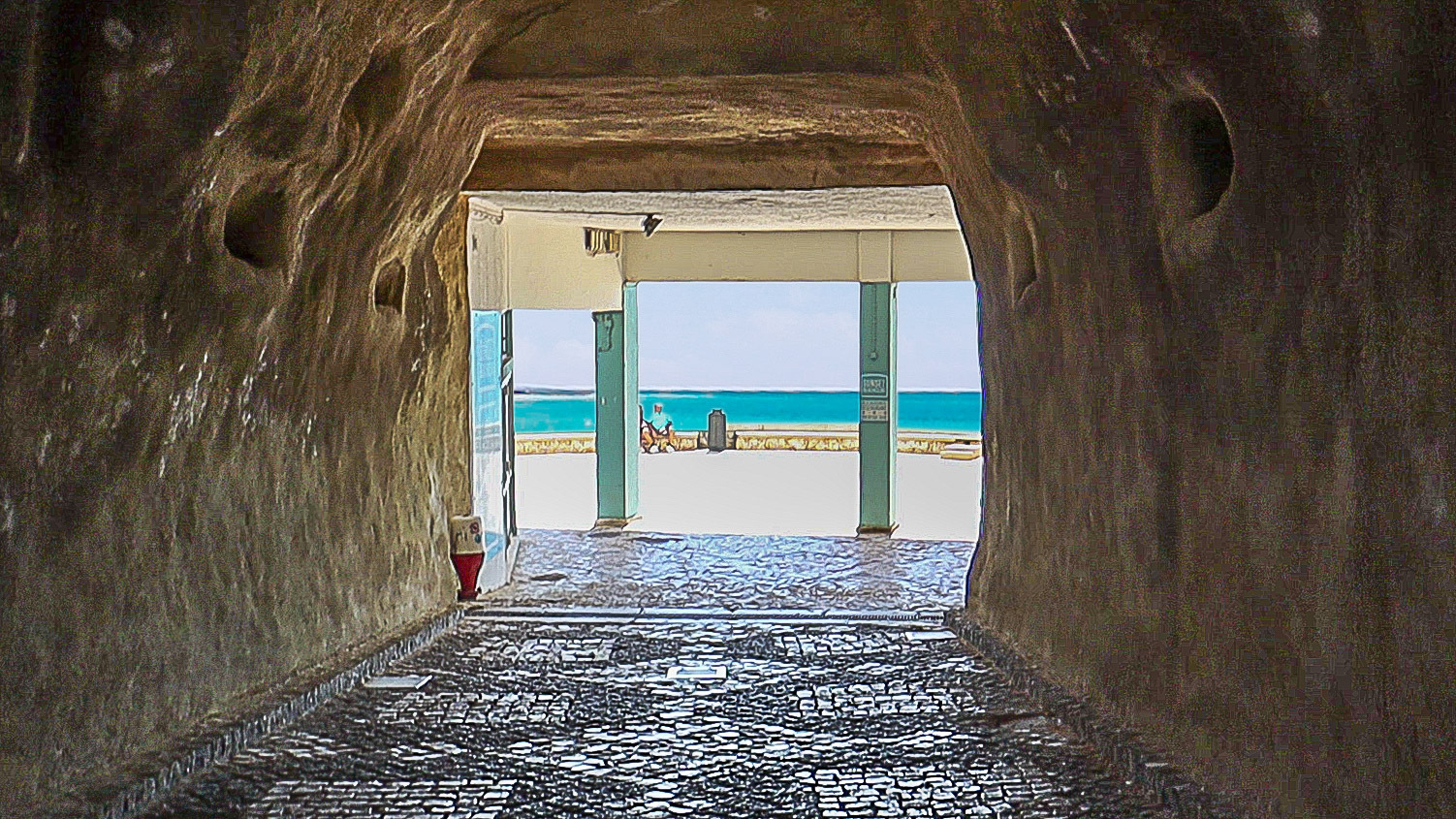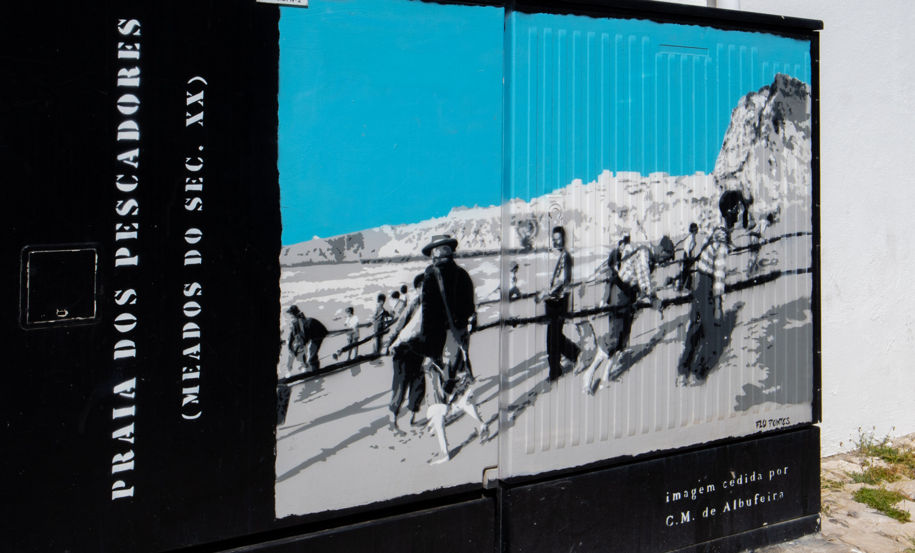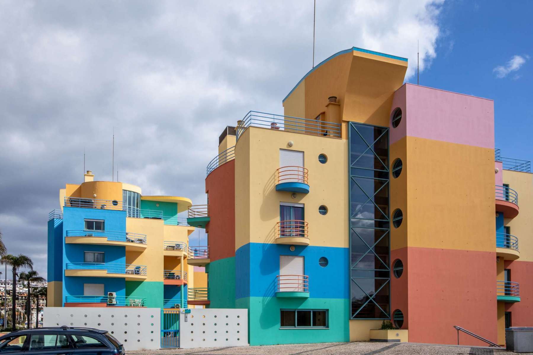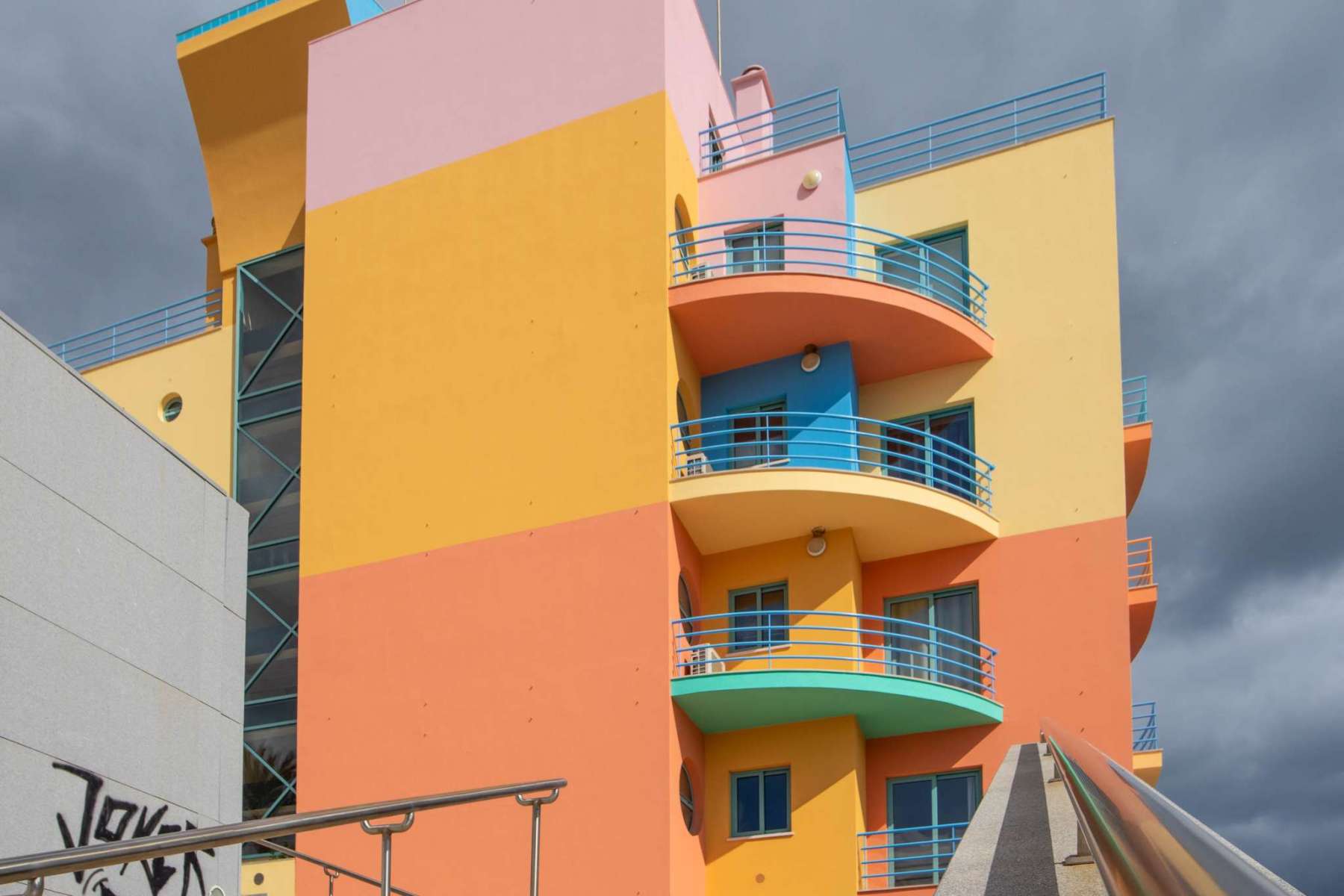 Vom Hügel herunter – Albufeira ist zum Teil sehr hügelig – komme ich unten an einem Kreisverkehr mit schönem Brunnen an. Direkt dahinter erstreckt sich eine Straße mit interessanten, bunten Häusern. Nachdem ich das etwas mit Hundertwasser verglichen hatte auf Polarsteps, hat jemand geschrieben, das sei eher das Ergebnis eines bekifften „Bauhaus Junkies“.