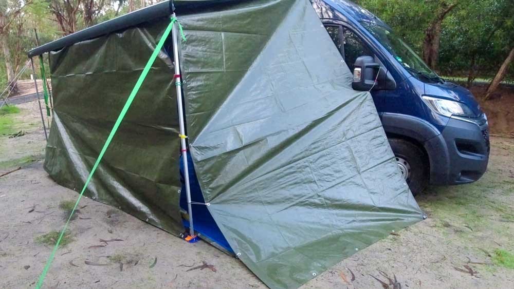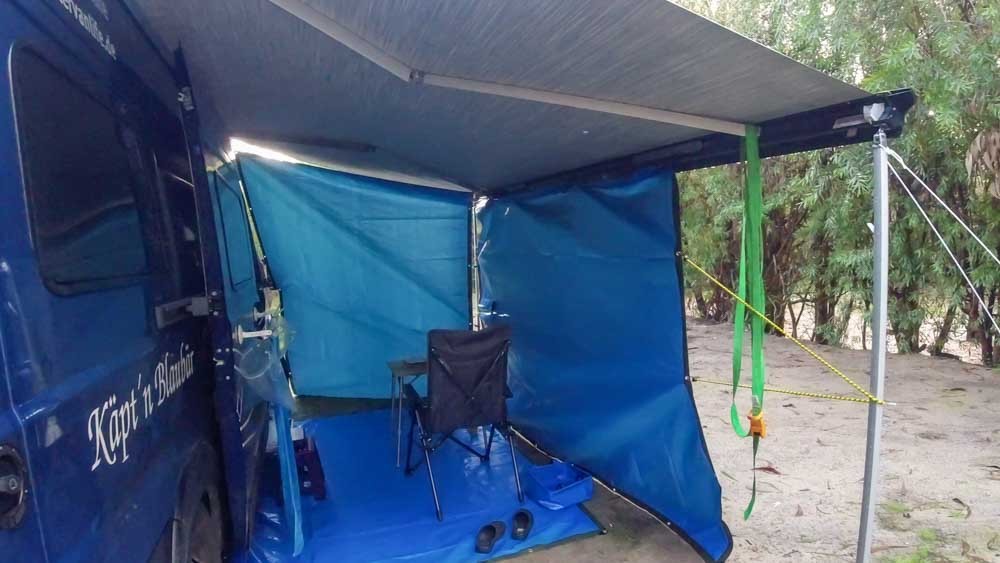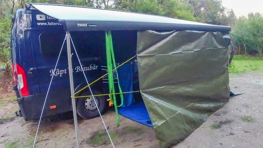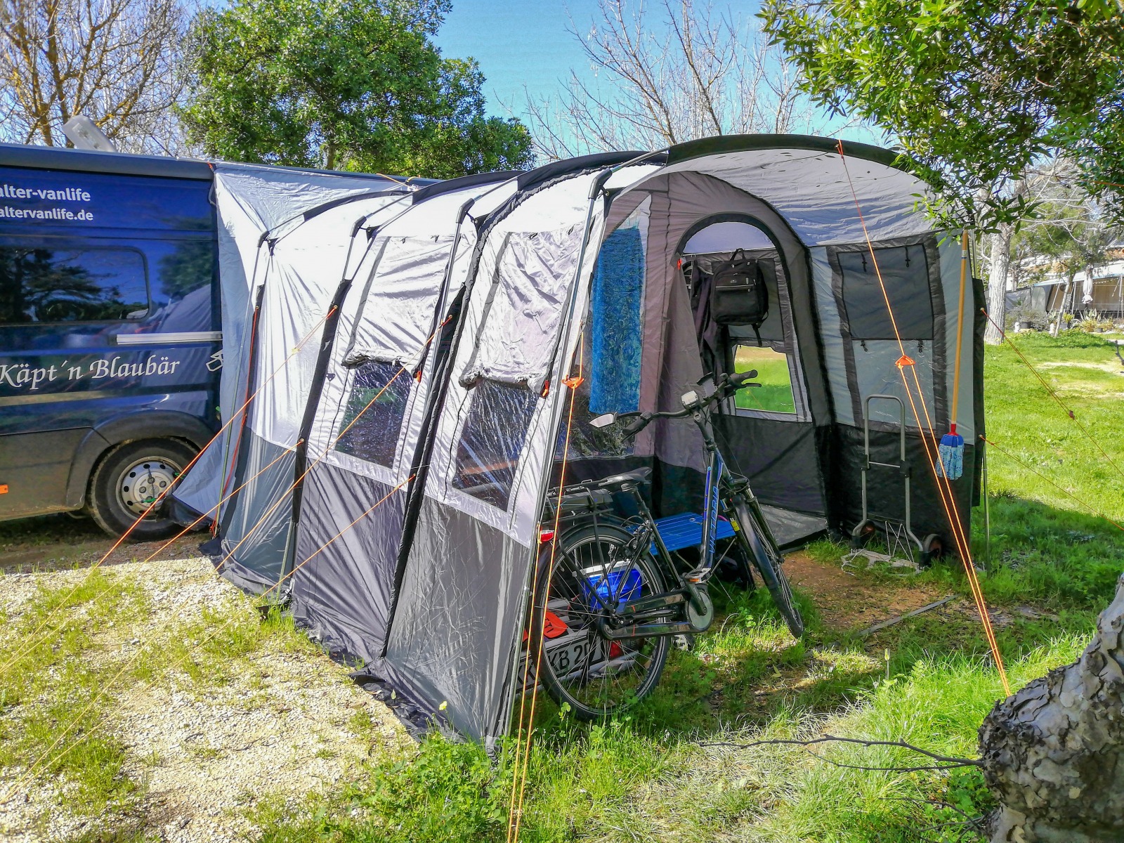 Ich habe den Anbau aus dem Grund bestellt, weil es dann einfacher ist, wenn ich mal mit dem Camper weg fahren möchte zum Einkaufen. Bei der Do-it-yourself-Lösung mit der Markise, muss ich immer alles demontieren, weil ja alles an der Markise hängt, die ich einfahren muss. Beim Vorzelt kann ich die Befestigungen am Fahrzeug lösen, das Zelt auf der Fahrzeugseite verschließen und losfahren.