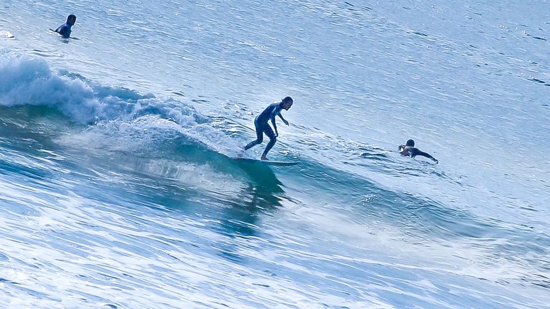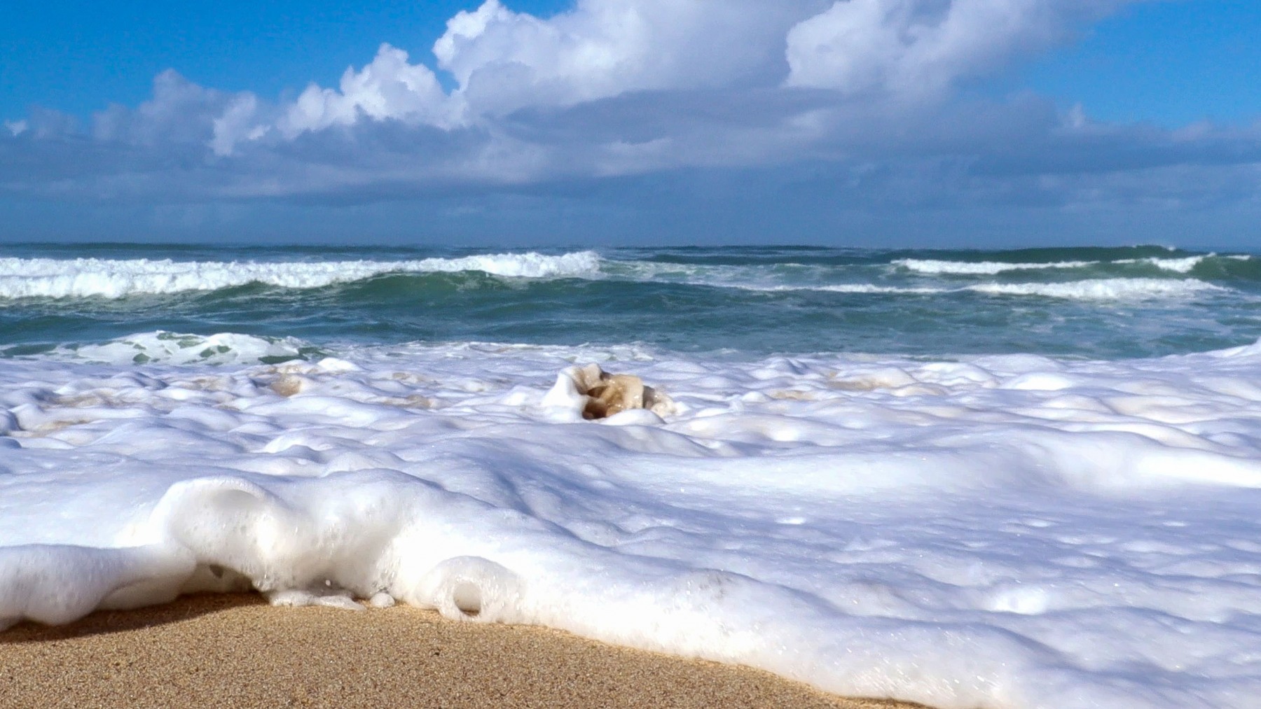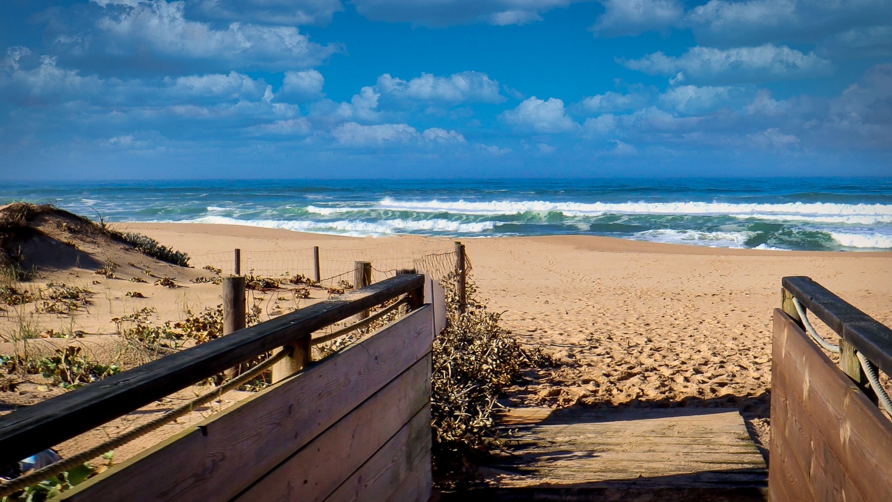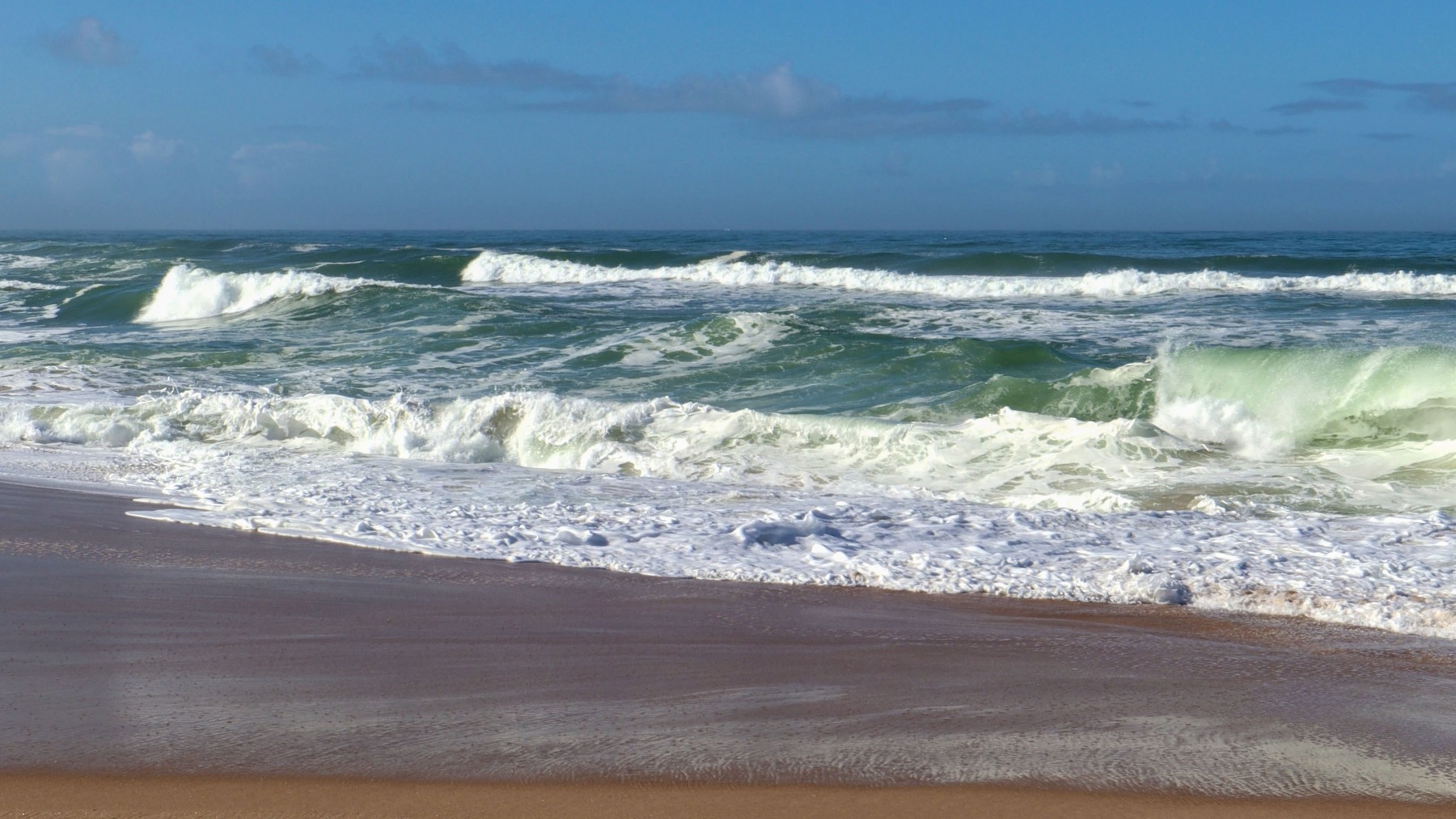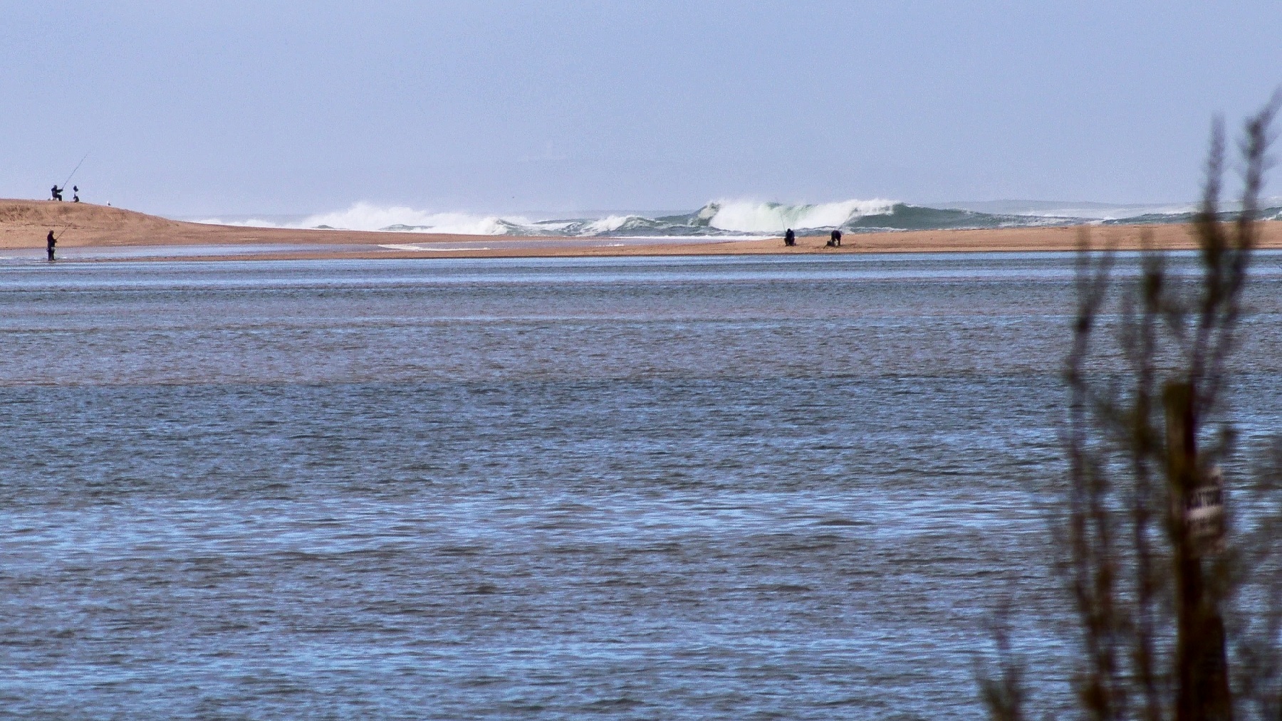 Auf dem Weg zum nächsten Spot, entdecke ich im Vorbeifahren einen großen Parkplatz fast am Meer. Ich halte an und es führt mich ein schöner Holzsteg durch die Dünen vorbei an einer zur Zeit geschlossenen Bar direkt zum Strand. Dort erwarten mich wieder schöne, große Wellen, die ich in Bild und Video festhalten will. Ich plane einen Videoclip, wie ich durch den Wellensaum laufe. Da ich aber alleine bin, muss ich die Kamera dazu auf einem kleinen Stativ in den Sand stellen, starten und dann loslaufen.
