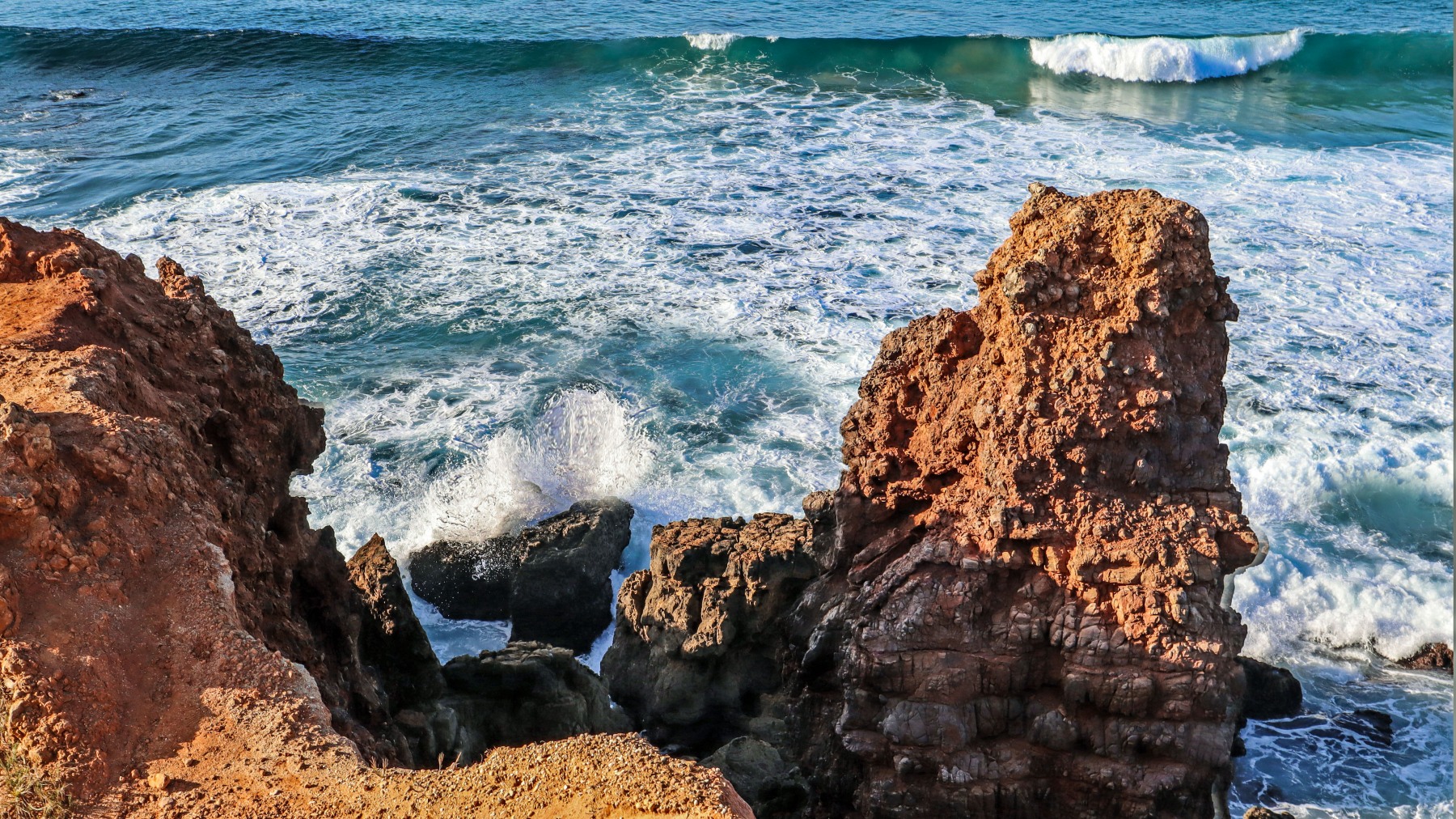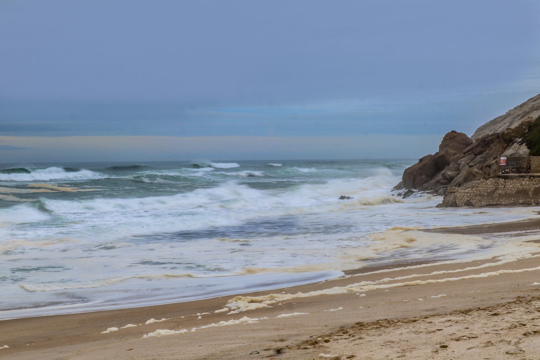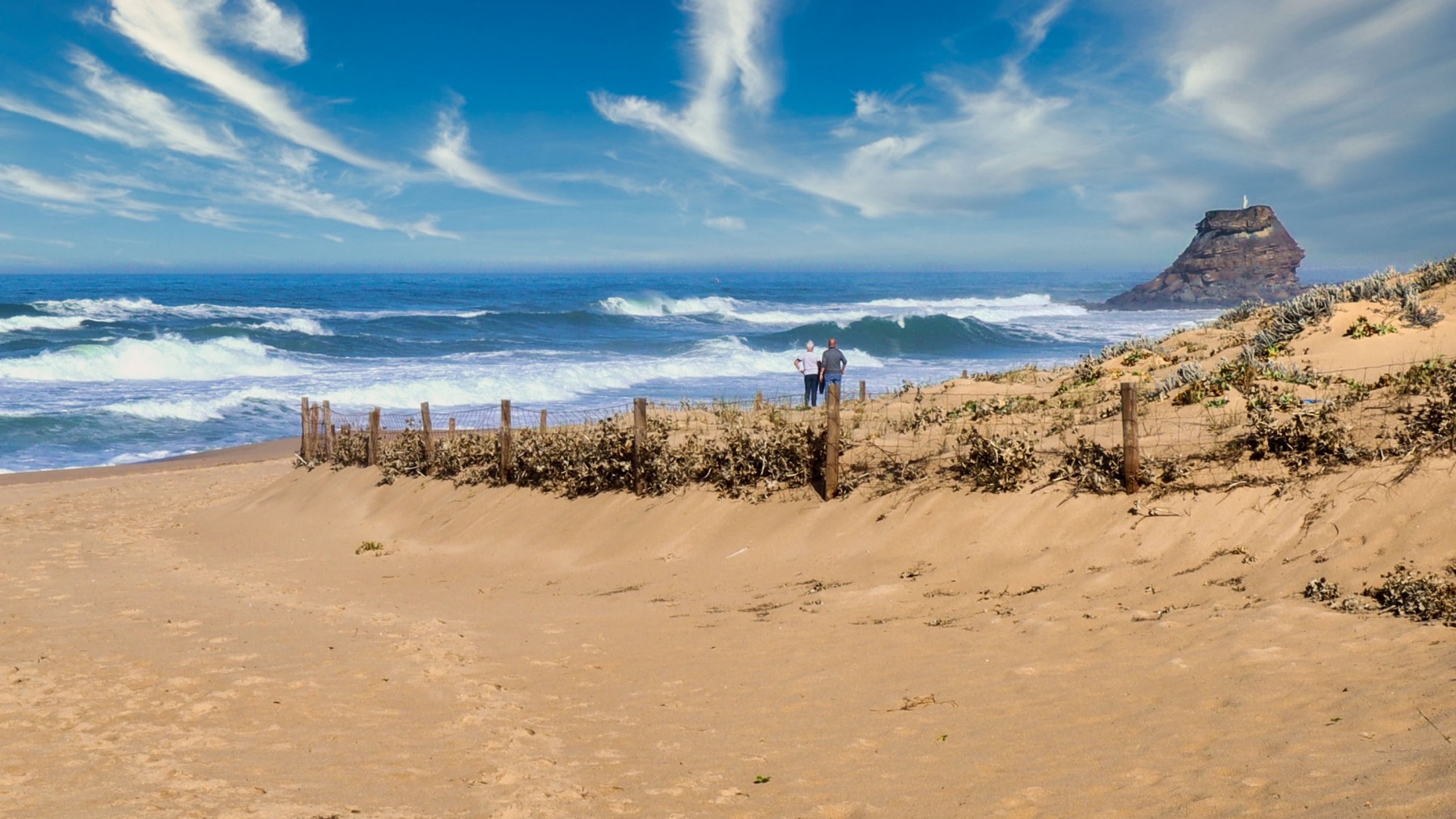 Auf dem Rückweg nach Setubal komme ich noch an einem kleinen Ort mit Strand vorbei, an dem einige Surfer ihr Können probieren und sich ein paar imposante Felsen zum Land erheben.