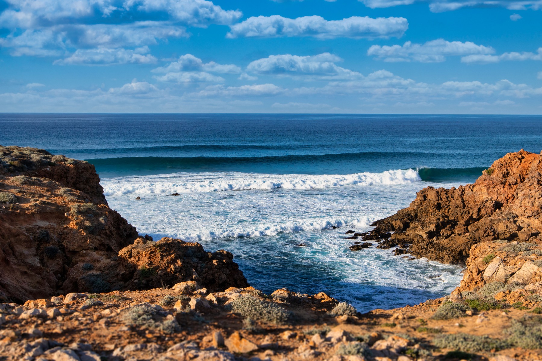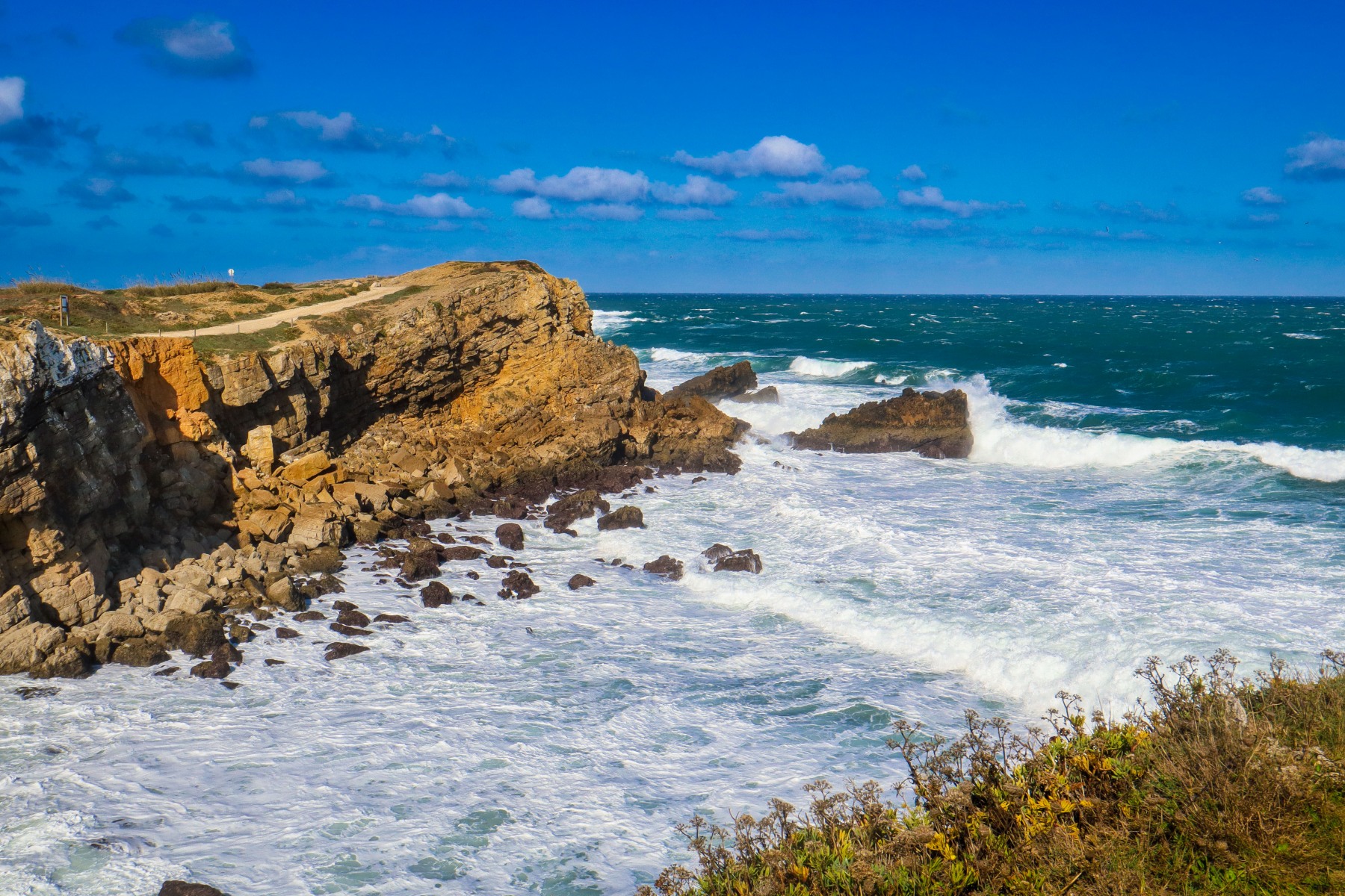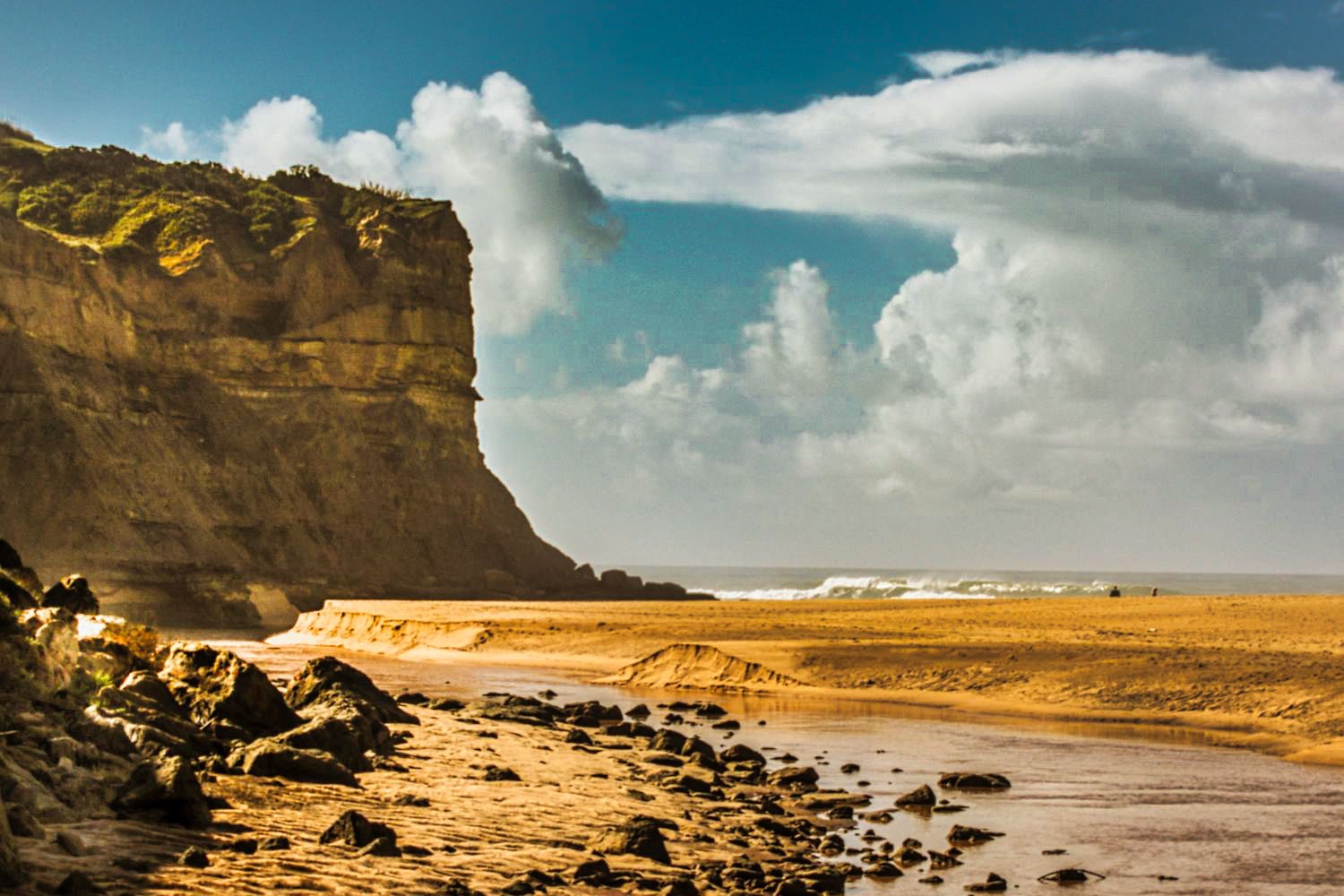 An diesem See, dem Strand und dem daran anschließenden Hang entlang führt ein Sand-Weg zu der Steilküste am Atlantik. Ich entschließe mich, diesen Weg zu gehen, weil ich mir erhoffe schöne Aufnahmen von den Felsen und der Brandung zu machen. Den letzten Teil des Weges führt ein Holzsteg über felsiges und bewachsenes Gelände bis vorne an die Klippen. Unterweg auf dem Steg begegnen mir immer wieder Surfer mit ihren Bretten, die gerade den Hang vom Strand heraufgeklettert sind und zu ihren Autos gehen. Aha, ich hätte also auch bis hier oben zu dem kleinen Parkplatz fahren können. Vorne an der Klippenkante erwarten mich dann auch sehr schöne Ausblicke auf die Felden und die Brandung.