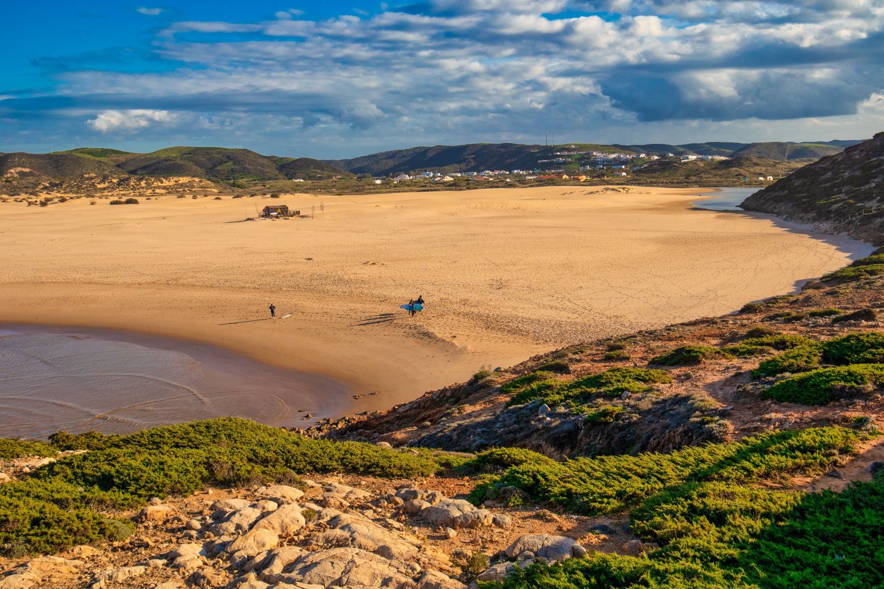 Heute will ich direkt durch zur Algarve fahren, steuere unterwegs aber noch eine sehr schöne Buch an die Praia da Bodeira. Hier mündet ein kleines Flüsschen ins Meer, bildet aber vorher noch einen großen See, sehr flach in dem man schön baden könnte. Der Strand ist nicht sehr breit dafür endlos tief.