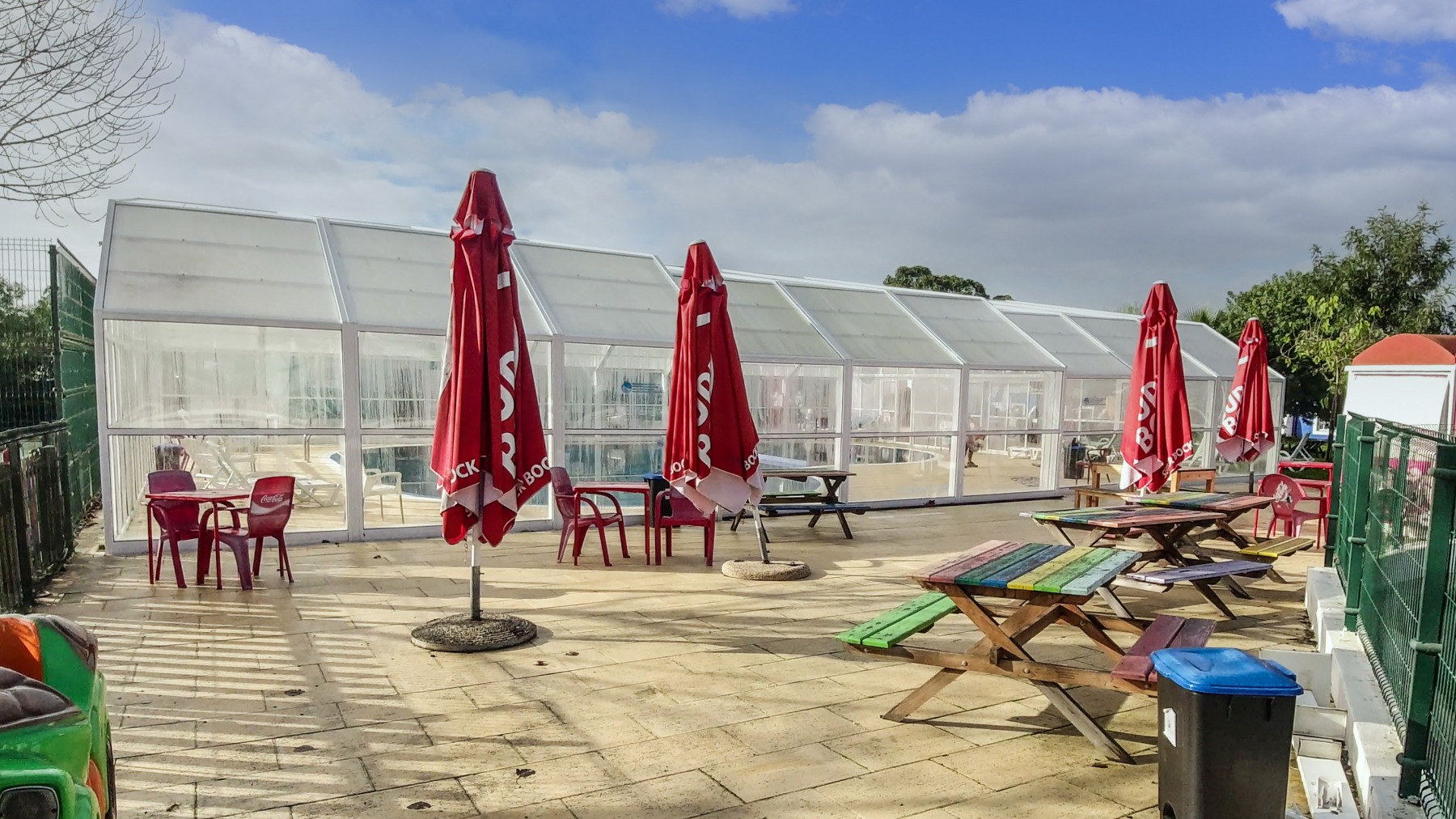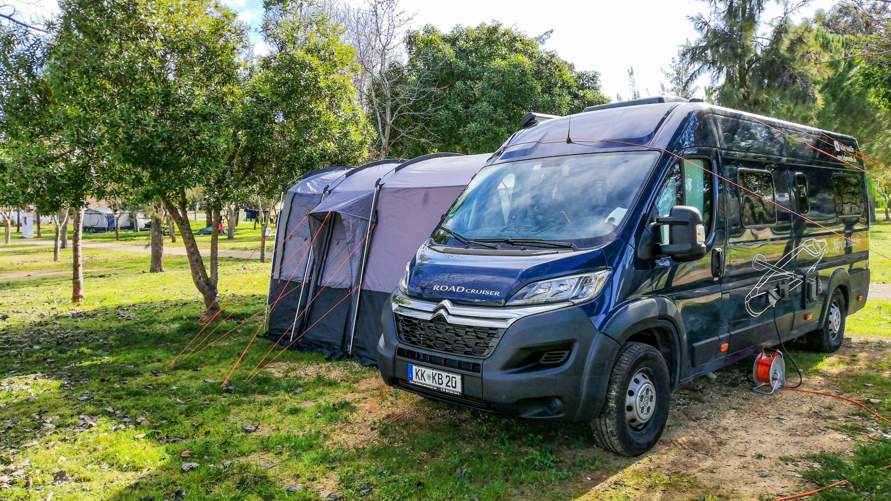 Gegen 14 Uhr komme ich am Campingplatz Albufeira an, checke ein, erst mal für 3 Nächte zum Probieren. Der Platz ist sehr wenig besetzt, wodurch auf der mit Bäumen besetzten Ebene große Freiflächen zwischen den einzelnen Campern entstehen, was ja bei der derzeitigen C-Situation nicht verkehrt ist. Es gibt hier mehrere Sanitärgebäude mit Spülbecken, Waschbecken, Toiletten und Duschen mit kostenlosem heißem Wasser. In einem Sanitärgebäude gibt es Waschmaschinen und Trockner, so dass man für die Wäsche nicht den Platz verlassen muss. Am Eingang steht ein kleiner Supermarkt, etwas teuer aber man bekommt hier die nötigsten Artikel für den täglichen Bedarf. Auch die Kosten für Stellplatz mit Strom sind moderat, ich zahle je nach Buchungsdauer hier in der Nebensaison zwischen 9€ und 10€. Der Platz ist gut gesichert, ich weiß nicht, ob das hier an der Algarve nötig ist, aber es kann ja nicht schaden und gibt ein gutes, sicheres Gefühl. Man kommt zu Fuß nur mit einer Zugangskarte durch das Drehkreuz und beim Auto öffnet sich die Schranke nur, wenn das Nummernschild registriert ist. Außerdem ist das Ganze Gelände rundherum eingezäunt und an der Schranke steht tagsüber ein Mitarbeiter, der die ein- und ausfahrenden Fahrzeuge kontrolliert. Ich suche mir einen schönen Platz und baue erst einmal mein provisorisches Vorzelt auf. Da es mir hier sehr gut gefällt, beschließe ich tagsdrauf auf unbestimmte Zeit zu bleiben zumindest aber über Weihnachten und Silvester.