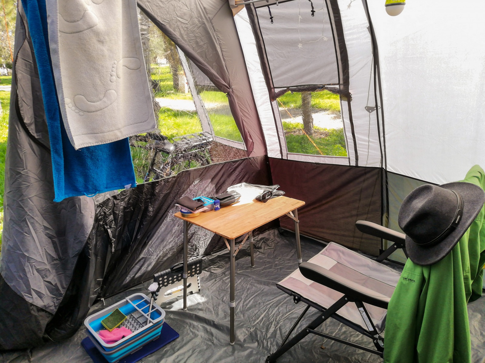So ziehe ich einige Meter weiter auf einen anderen Platz und baue dort mein neues Vorzelt auf, das gestern angekommen ist.