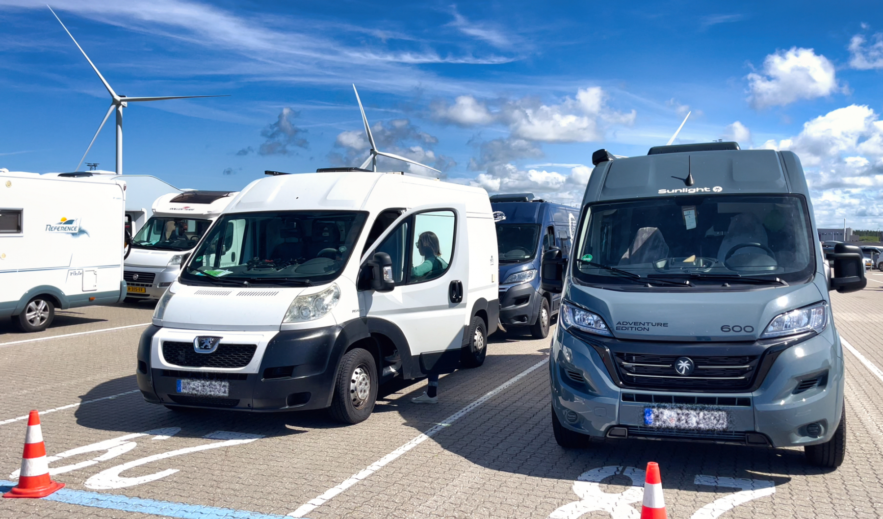 Nach einer unruhigen Nacht – Tommy wollte um 4 Uhr raus – einer Runde mit Tommy gegen 8 Uhr und dem Frühstück, ging es gegen 10 Uhr los. Erst Ver- und Entsorgen, Tanken für 1,389€/Liter Diesel und dann die knapp 40 km zum Reisstrand (warum der so heißt?), wo Hans uns Caro, Hexe (richtiger Vorname mir unbekannt) schon sind. Herzliche Begrüßung und ich werde hier eine Nacht bleiben. Auch hier weht es ziemlich heftig, doch wenn man die Schiebetür nach Lee (Wind abgewandt) ausrichtet, kommt nur wenig Sand in den Camper. Ich parke nicht direkt vorne am Strand, weil ich bemüht bin, diese Plätze den Einheimischen zu überlassen.