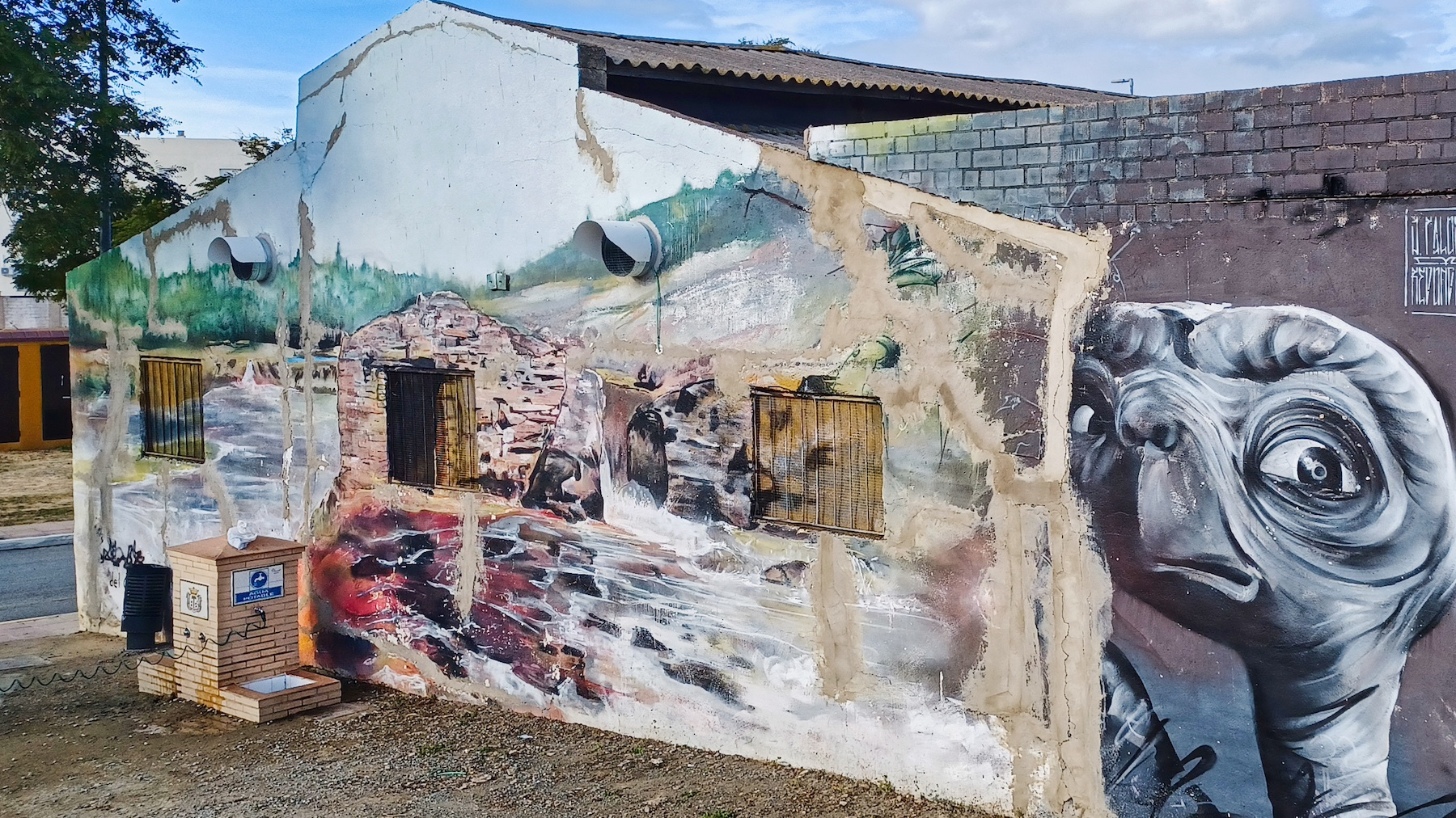 Nach dem Frühstück verabschiede ich mich von Caro, Hans, Hexe und Sabine. Ich habe gestern auf der Fahrt zum Playa del Arroz unterwegs eine verlassene Moschee gesehen, die will ich mir heute mal ansehen. Alle äußeren Fenster der Gebäude sind zugemauert alle Türen verschlossen, doch auf der Rückseite gibt es ein Loch in einer Mauer, durch das ich auf das Gelände kann. Hier treffen alte Gemäuer auf moderne Kunst.