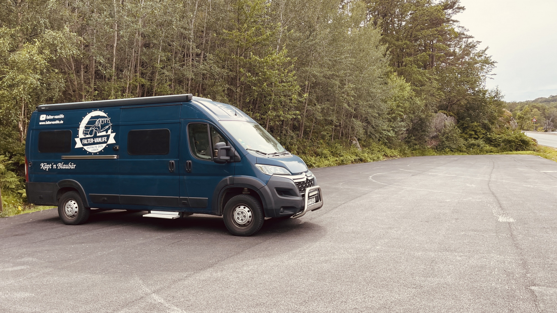 Neben mir Parkt ein Camper aus Füssen mit einem historischen Auto auf dem Hänger, einem „amphicar“ einem Amphibien-PKW aus den 60er Jahren.