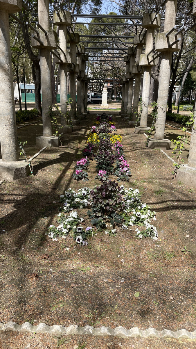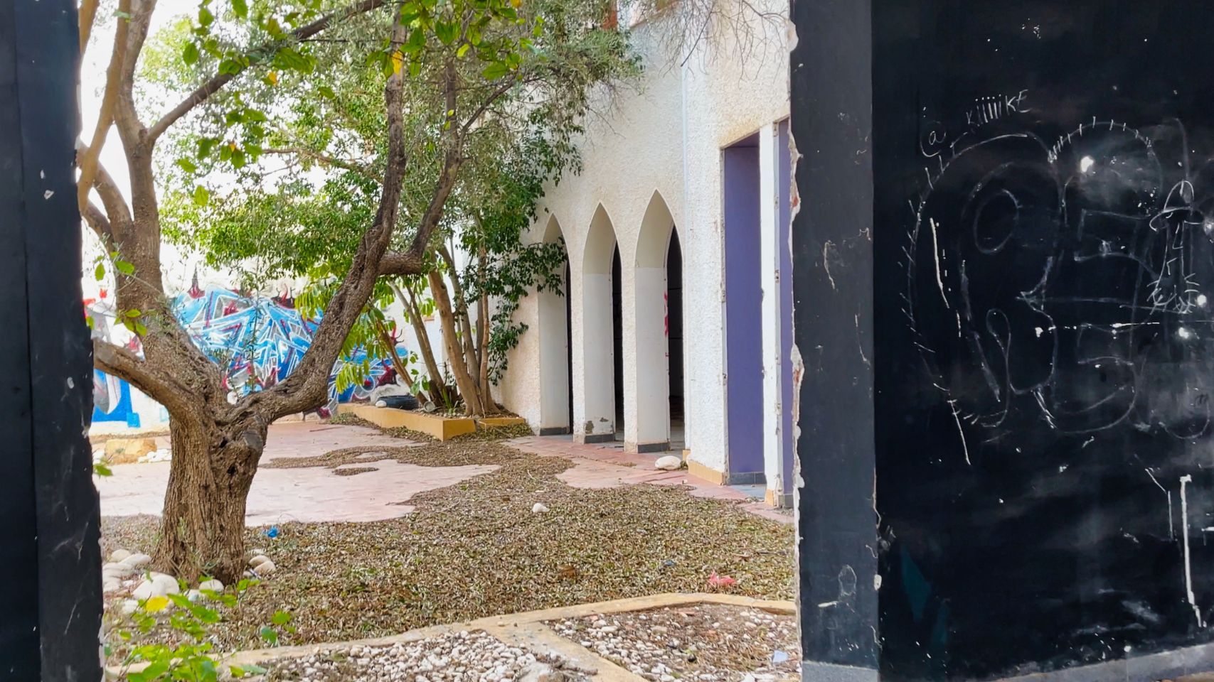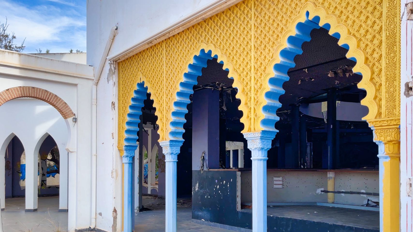 Nach dem Frühstück verabschiede ich mich von Caro, Hans, Hexe und Sabine. Ich habe gestern auf der Fahrt zum Playa del Arroz unterwegs eine verlassene Moschee gesehen, die will ich mir heute mal ansehen. Alle äußeren Fenster der Gebäude sind zugemauert alle Türen verschlossen, doch auf der Rückseite gibt es ein Loch in einer Mauer, durch das ich auf das Gelände kann. Hier treffen alte Gemäuer auf moderne Kunst.