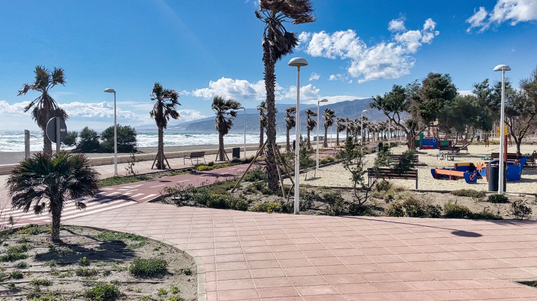 So bin ich weiter nach Almeria gefahren auf einen Parkplatz direkt an der schönen Strandpromenade. Kaum hatte ich die Schiebetür geöffnet wehte Sand ins Wohnmobil. Heute ist es hier am Meer sehr stürmisch, man kann nicht über die Strandpromenade laufen, weil einem andauern Sand ins Gesicht gepeitscht wird und im WoMo wird man durchgeschüttelt wie auf einem Schiff. Normalerweise ist das ein schöner Platz, um ein paar Tage zu stehen, mit der schönen sehr langen Strandpromenade und dem Kinderspielplatz, doch bei dem Sturm…. Daher habe ich nach einem Spazierversuch mit Tommy den Platz wieder verlassen und bin auf einem Parkplatz in der Nähe des trockenen Flussbettes des Andarax gefahren. Hier ist es wesentlich ruhiger und eigentlich könnte man hier schön mit Tommy durch den Park nebenan spazieren, doch der ist leider genau wie der neben dem Stellplatz in Abla geschlossen, ich vermute wegen des Sturmes. Hier besteht auch eine Sturmwarnung für diese Tage mit Wind um 90km/h.
