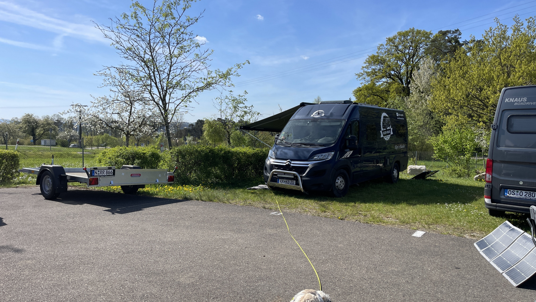 Neben mir Parkt ein Camper aus Füssen mit einem historischen Auto auf dem Hänger, einem „amphicar“ einem Amphibien-PKW aus den 60er Jahren.
