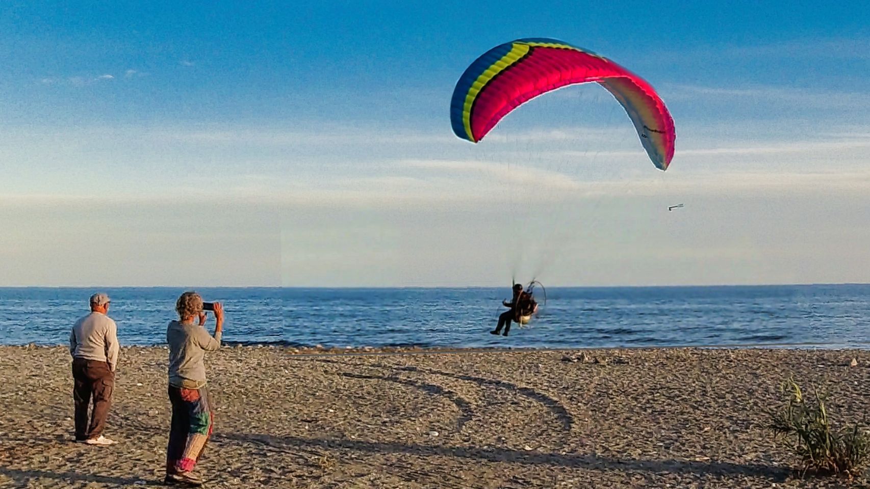 Gestern Abend konnten wir noch einen Motorgleiter starten und landen sehen hier am Strand.