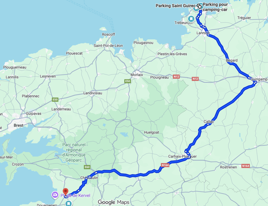 Dann ging es weiter über 2 Std. Fahrt in die Nähe von Locronan, das wir uns morgen ansehen wollen. Gelandet sind wir auf einem kostenlosen schönen Stellplatz.
