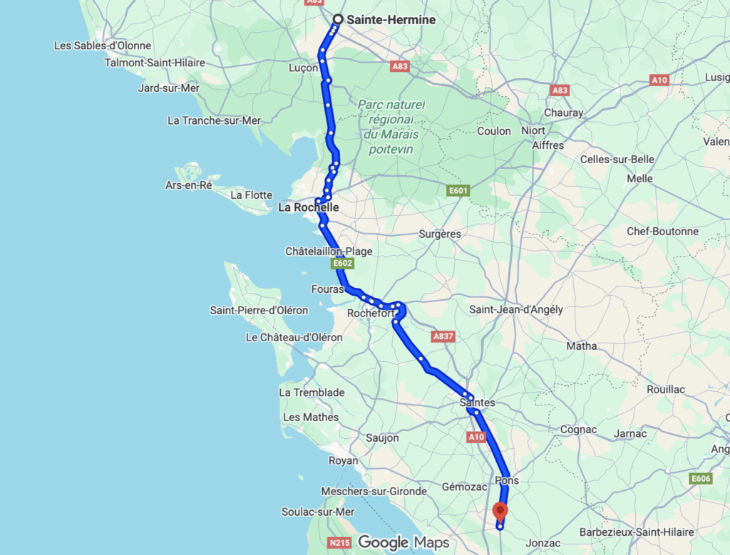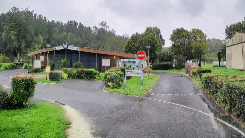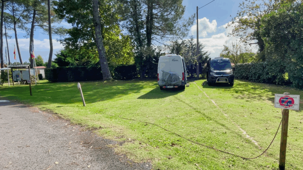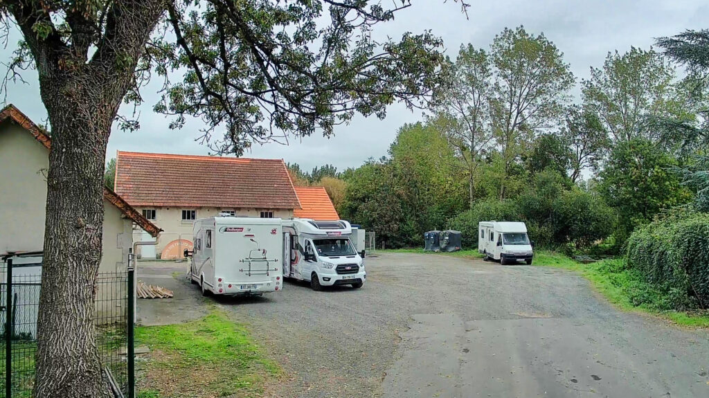 Ich bin weiter nach Saint-Hermine gefahren, wo ich eigentlich auf einen schönen Stellplatz wollte, der jedoch im Hauptbereich geschlossen war. Der Vorplatz auf Schotter ist klein und nicht gerade einladend, außerdem standen dort schon drei Camper. So bin ich zum nahen Sportplatz gefahren, an dem es mehrere Parkstreifen gibt, auf denen man sicher ruhig übernachten kann.