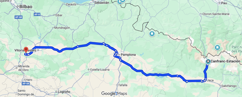 Heute sind wir gegen 10:30 gestartet Richtung Osten in die Pyrenäen. Es ging bei schönstem Wetter und 20-23° C durch eine traumhafte Landschaft in den nördlichen Ausläufern der Pyrenäen mit vielen Weitblicken. Zwischendurch kurz bei Lidl einkaufen, dann weiter in die höheren Bergregionen nach Canfranc zu einem alten Bahndepot und einem bombastischen Bahnhofsgebäude, das wir uns morgen ansehen wollen.