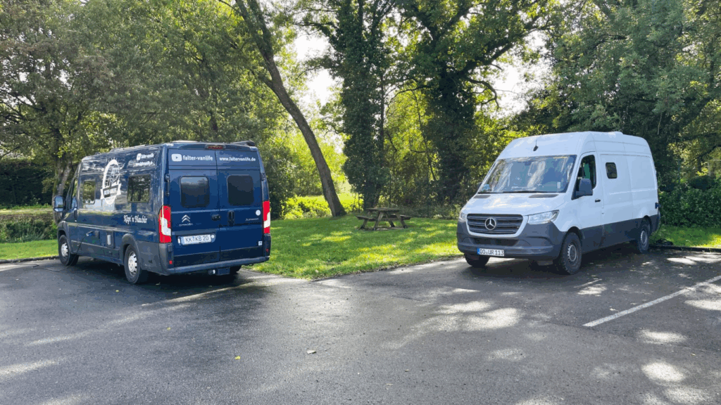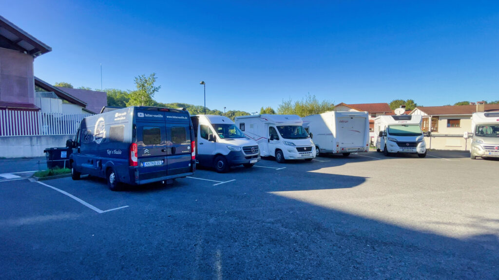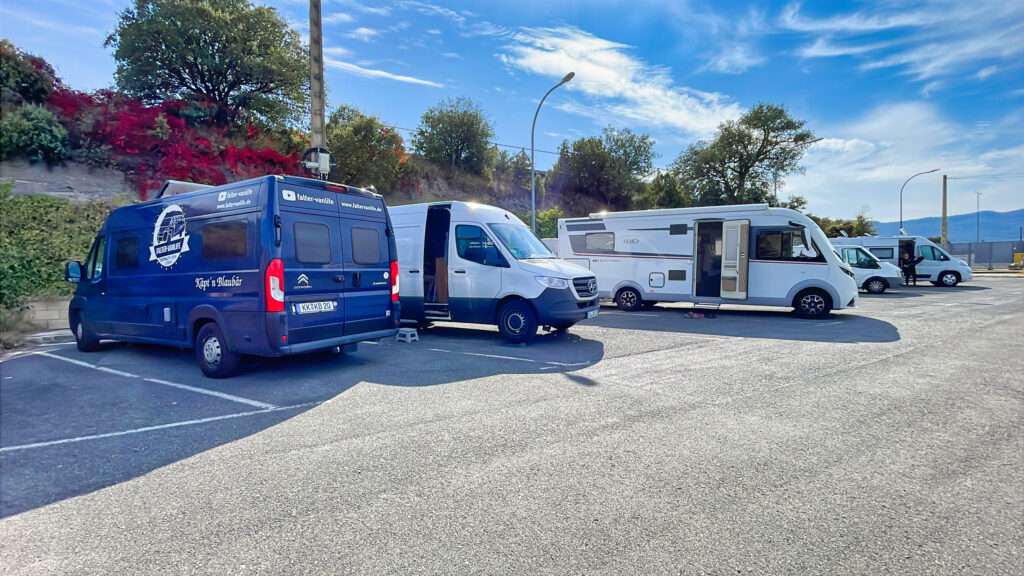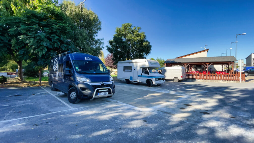 Uschi steht auf dem kostenpflichtigen Stellplatz wegen Strom und mein Camper steht auf dem kostenfreien Parkplatz in der Nähe.