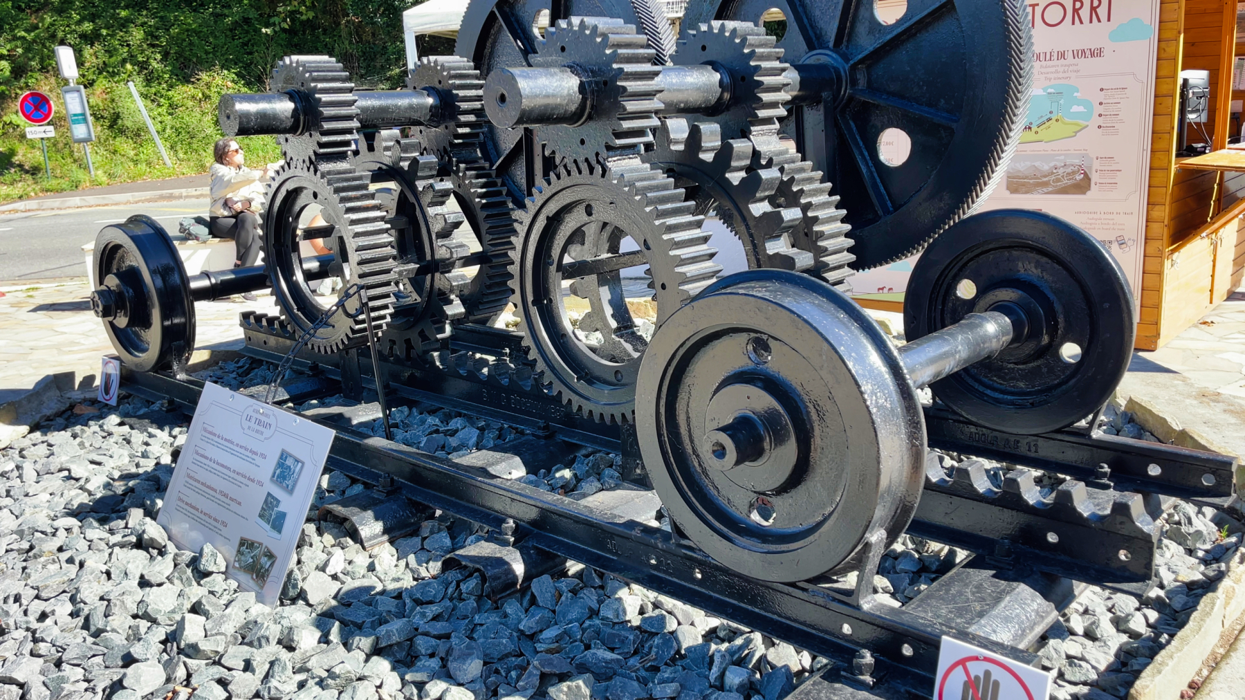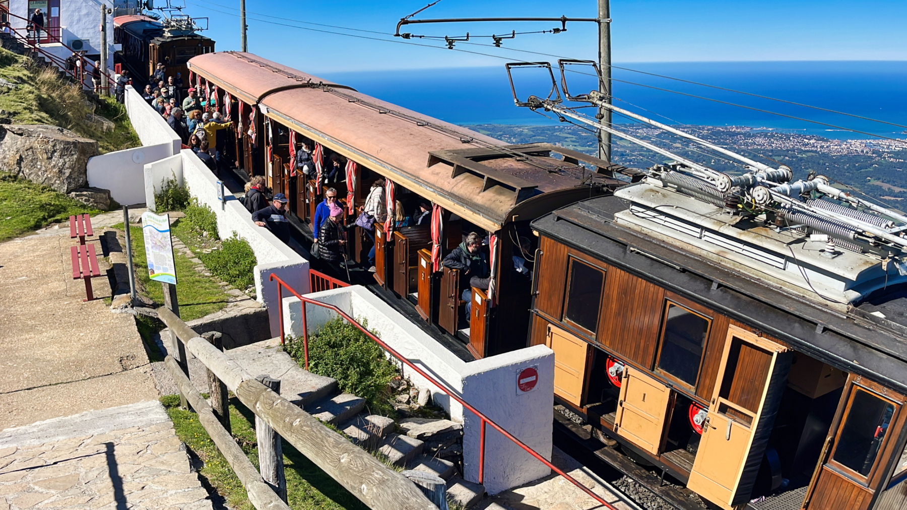 Nach einer ruhigern Nacht sind wir heute schon früh um 9:15 gestartet und über eine sehr schöne Strecke mit vielen Kurven zum Le Train de la Rhune gefahren. Es ist eine Zahnradbahn aus dem frühen 20. Jh., die einen von der Talstation auf 180 m bis zur Bergstation am Col de Ignace auf über 800 m empor bringt, nicht ganz preiswert aber es lohnt sich – Danke Uschi für das Ticket. Während der Fahrt und oben am Gipfel haben wir traumhafte Ausblicke 12 km bis nach Saint Jean de Luz und Biaritz am Atlantik, zumal das Wetter mitspielt mit blauem Himmel und strahlendem Sonnenschein.