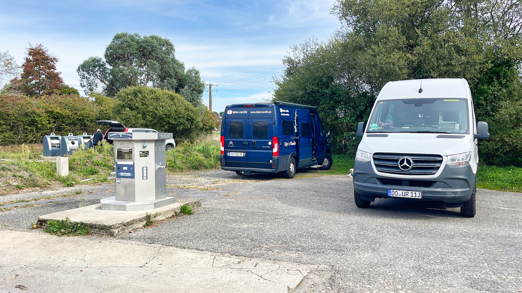 Uschi steht auf dem kostenpflichtigen Stellplatz wegen Strom und mein Camper steht auf dem kostenfreien Parkplatz in der Nähe.